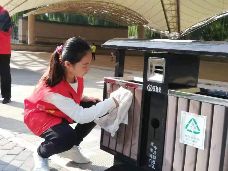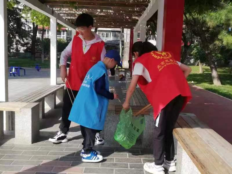此次活动的主要内容是捡拾白色垃圾,擦拭宣传展示牌和垃圾桶等。为了做到真正的绿色环保,在队长季国军、副队长张玉琴的倡议下,所有参加此次活动的义工队员都自带环保工具,有的队员将塑料袋二次利用装垃圾,有的队员用自家废弃的筷子捡拾垃圾,有的队员将自家不穿的衣服做成抹布擦拭展板和座椅。小朋友主动承担起擦拭垃圾桶的任务。